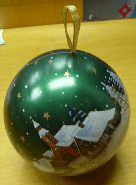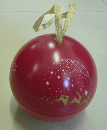 Metalinis burbuliukas - dėžutė su juostele. Galima kabinti ant eglutės, o viduje paslėpti saldainių.