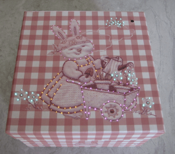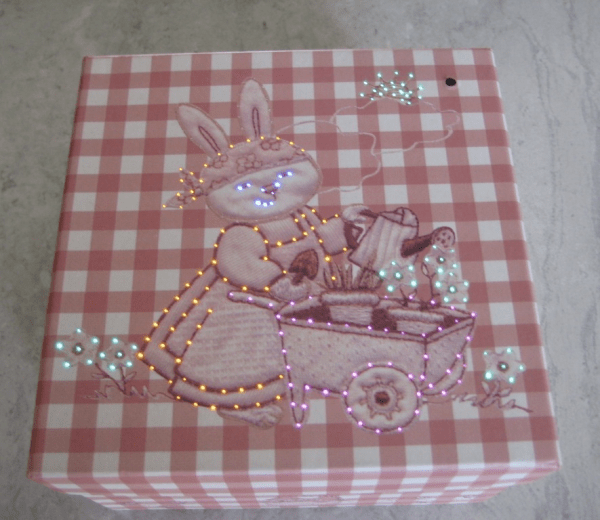 Dėžutė su mirksinčiomis lemputėmis. Norimo dydžio, su reikiama spauda. Smagi, šventinė, stebinanti pakuotė.