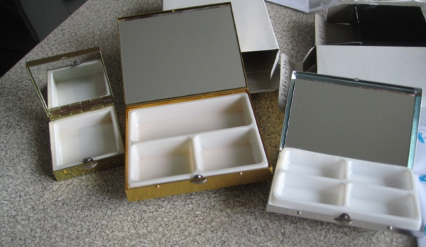 Elegantiškos, moteriškos vaistų dėžutės. Su veidroduku. Patogu, nes nereikia nešiotis didelių pakuočių. Paslapčių dėžutė.