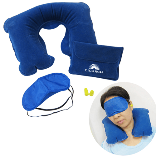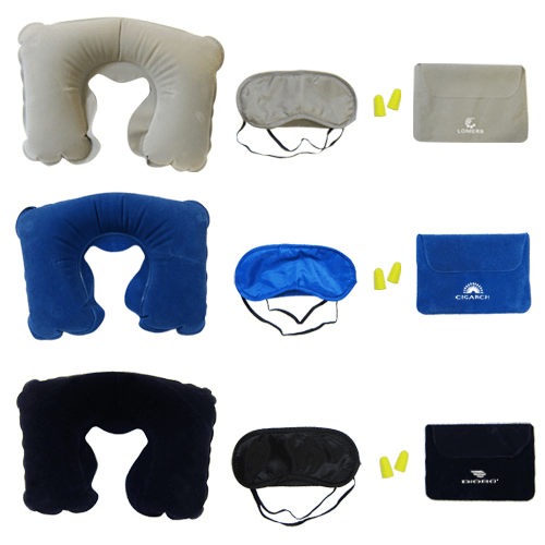Kelioninis rinkinukas: Pagalvėlė, ausų kamštukai, akių raištis. Keliaukite patogiai. Galimos įvairios spalvos, spauda.