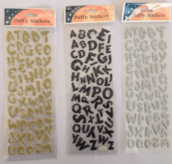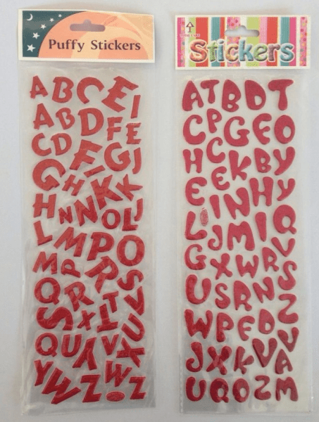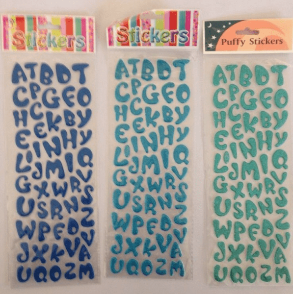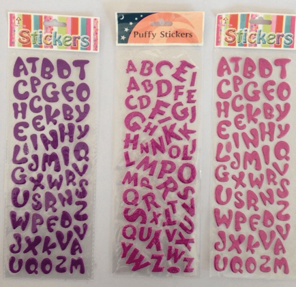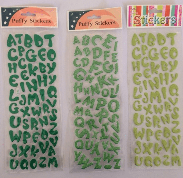 Įvairių spalvų ir formų lipdukai raidės.